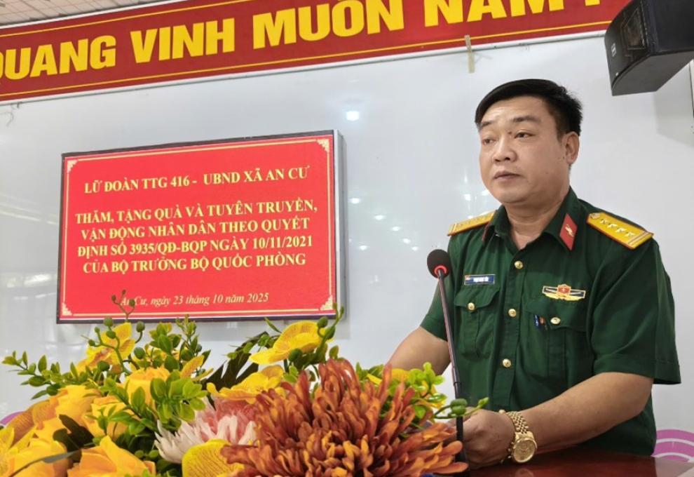Ngày 23/10, Lữ đoàn Tăng thiết giáp 416 (Quân khu 9) phối hợp cấp uỷ, chính quyền xã An Cư (tỉnh An Giang) tổ chức thăm, tặng quà và tuyên truyền, vận động nhân dân theo Quyết định 3935, ngày 10/11/2021 của Bộ Quốc Phòng, về thực hiện Chương trình mục tiêu quốc gia phát triển kinh tế - xã hội vùng đồng bào dân tộc thiểu số và miền núi năm 2025.