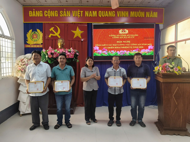 Dịp này Công an xã An Cư đã trao giấy Công nhận cho 16 đơn vị trường học, y tế, các ấp “Đạt tiêu chuẩn an toàn về An ninh, trật tự năm 2025” và khen thưởng cho 6 cá nhân đạt thành tích “Xuất sắc trong phong trào thi đua Vì an ninh Tổ quốc năm 2025”.