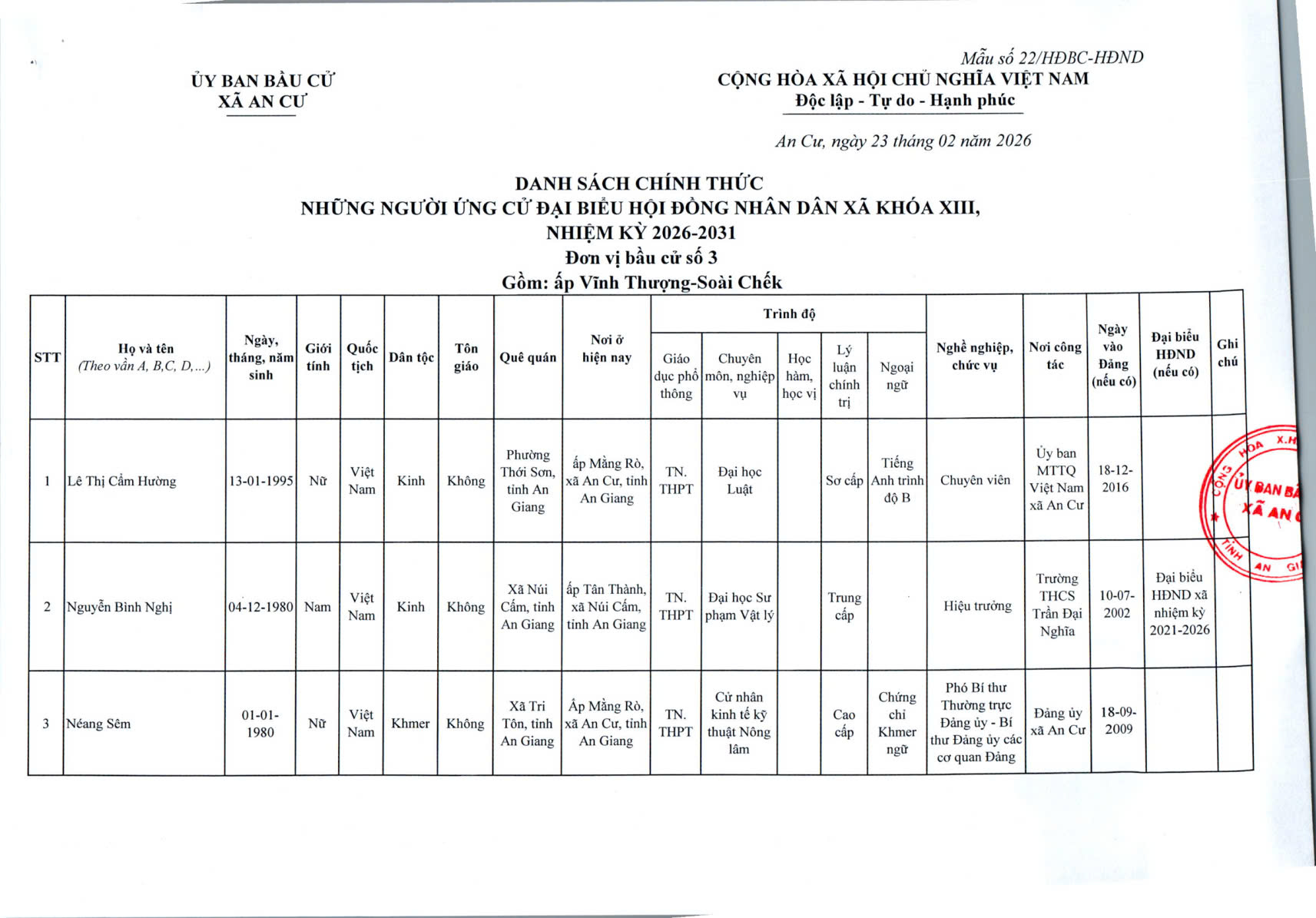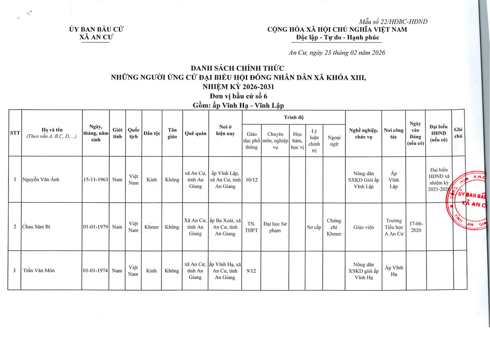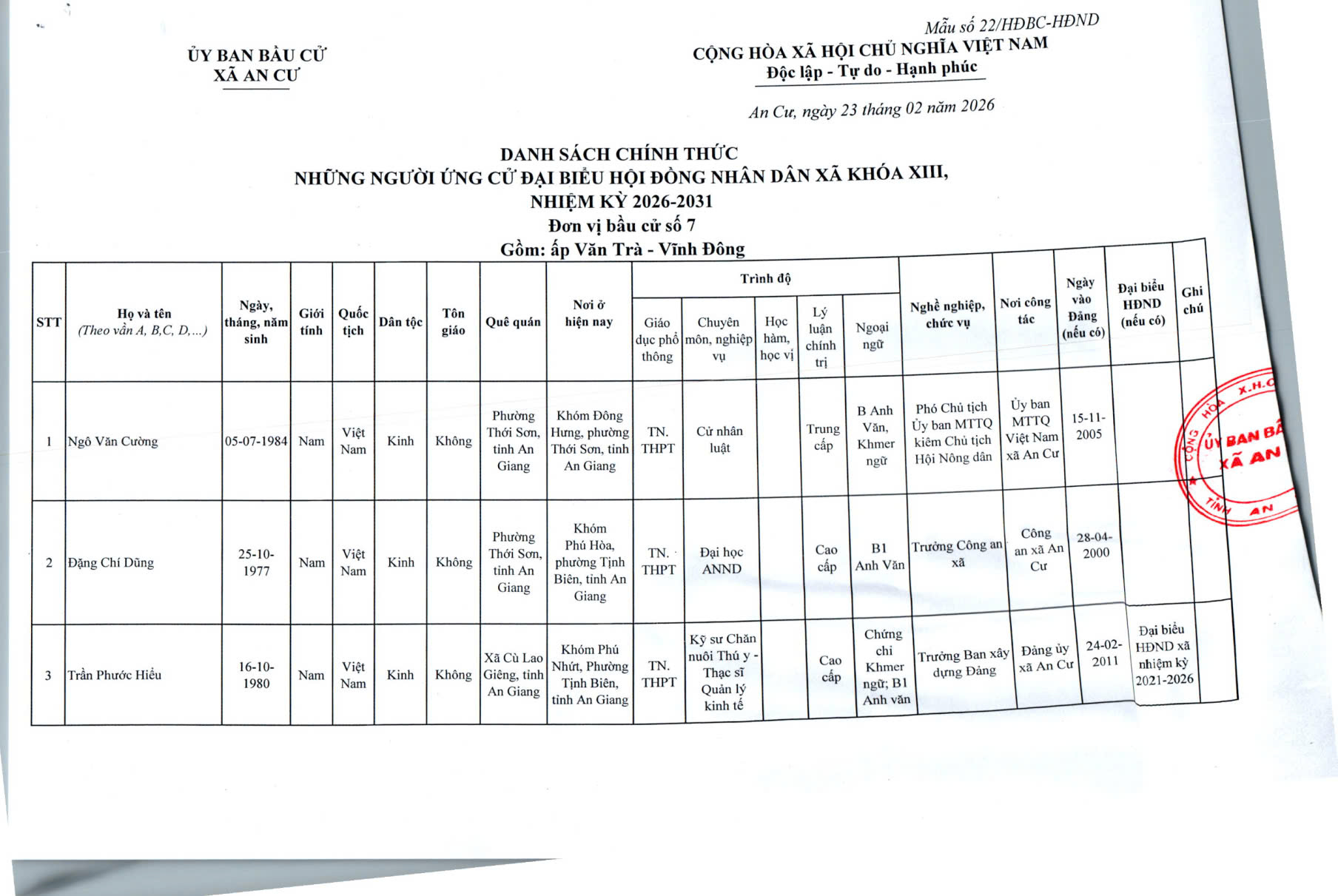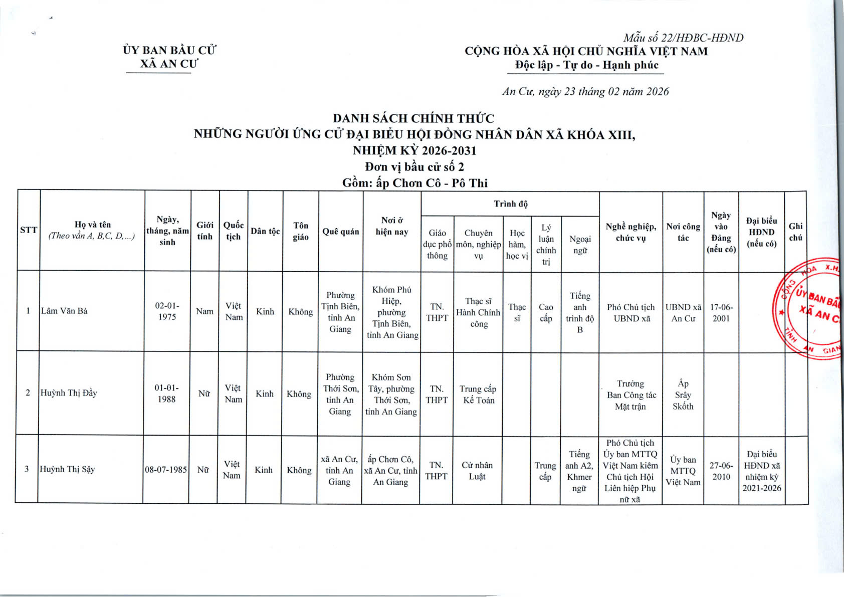 DANH SACH CHÍNH THỨC NGƯỜI ỨNG CỬ ĐẠI BIỂU HỘI ĐỒNG NHÂN DÂN XÃ AN CƯ KHOÁ XIII, NHIỆM KỲ 2026 - 2031