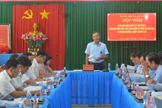 Sáng ngày 26/12/2025, Ban Thường vụ Đảng ủy xã An Cư (tỉnh An Giang) tổ chức Hội nghị Ban Chấp hành Đảng bộ xã lần thứ 3, nhiệm kỳ 2025-2030 (mở rộng) nhằm đánh giá tình hình thực hiện nhiệm vụ chính trị năm 2025, đề ra phương hướng, nhiệm vụ năm 2026. Dự và chủ trì hội nghị Bí thư Đảng ủy, Chủ tịch Hội đồng nhân dân xã An Cư Lưu Văn Đạo.