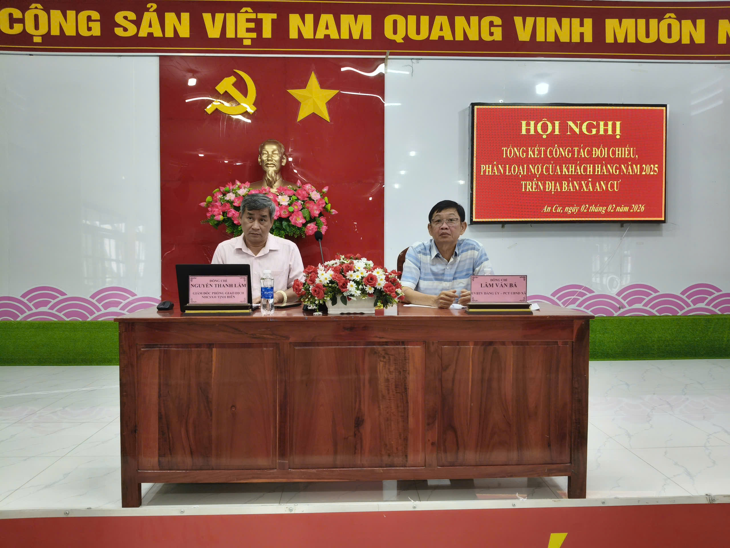 Ngày 02/02/2026, UBND xã An Cư tổ chức Hội nghị tổng kết công tác đối chiếu, phân loại nợ của khách hàng vay vốn Ngân hàng Chính sách xã hội trên địa bàn xã năm 2025. Tham dự hội nghị có ông Nguyễn Thanh Lâm, Giám đốc phòng Giao dịch Ngân hàng Chính sách xã hội Tịnh Biên; ông Lâm Văn Bá, Phó Chủ tịch UBND xã, cùng đại diện các ban, ngành, đoàn thể nhận ủy thác, Ban quản lý các Tổ tiết kiệm và vay vốn trên địa bàn xã.