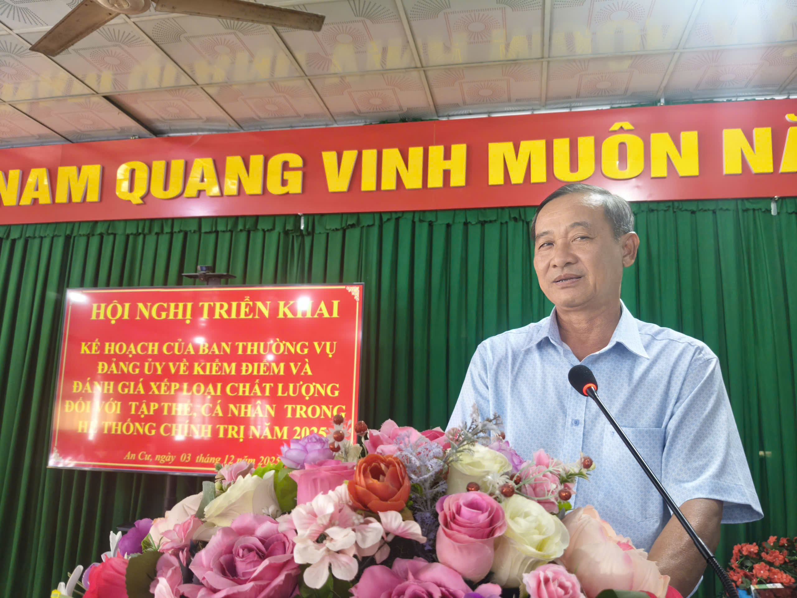 Ngày 03/12/2025, Đảng ủy xã An Cư tổ chức hội nghị triển khai Kế hoạch về công tác kiểm điểm, đánh giá xếp loại chất lượng đối với tập thể, cá nhân trong hệ thống chính trị của Đảng bộ xã năm 2025. Bí thư Đảng uỷ, Chủ tịch HĐND xã An Cư Lưu Văn Đạo chủ trì Hội nghị.